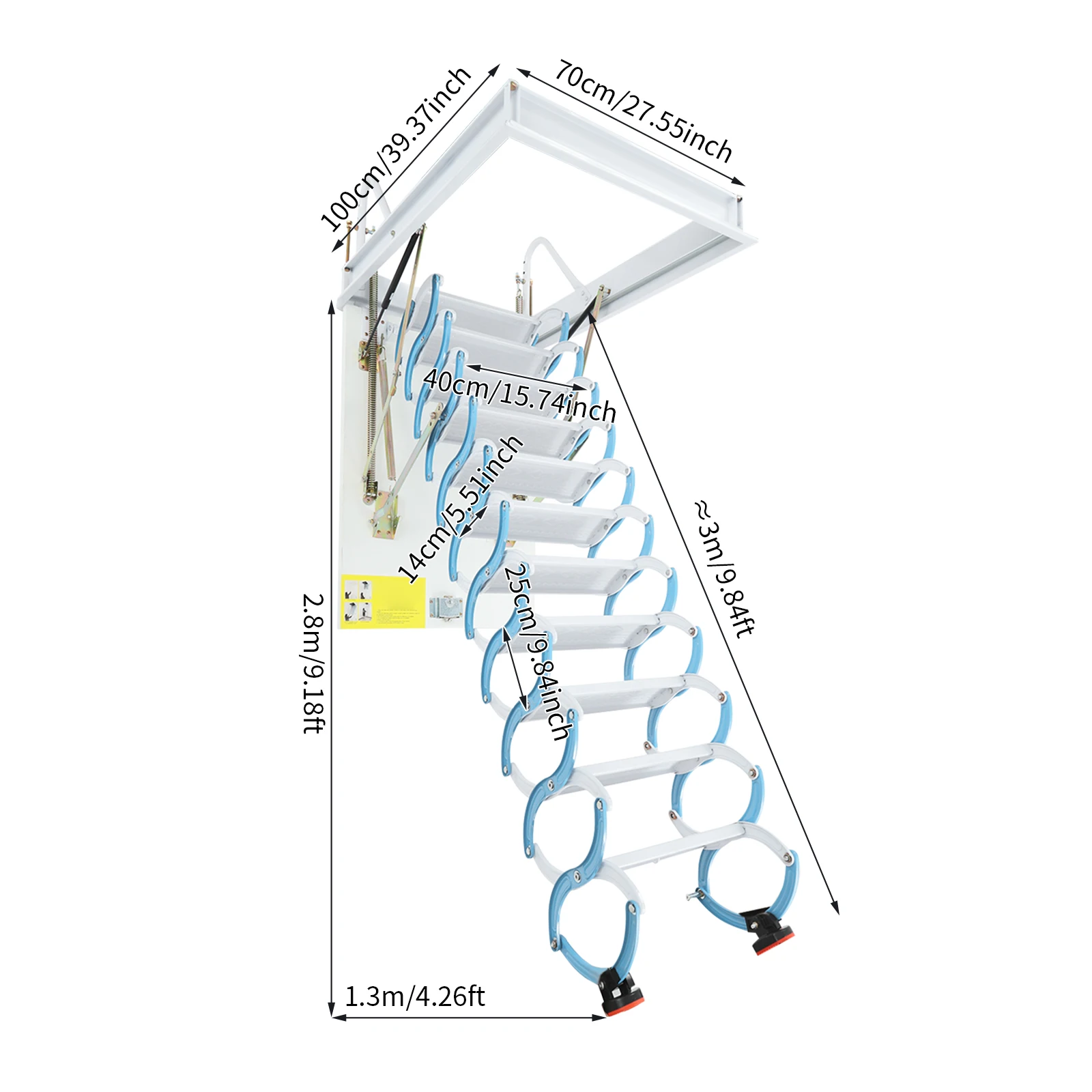 11 Steps Cold-rolled Steel Attic Ladder,70x100cm White/Blue Wall-Mounted Folding Stairs for Flat Roofs