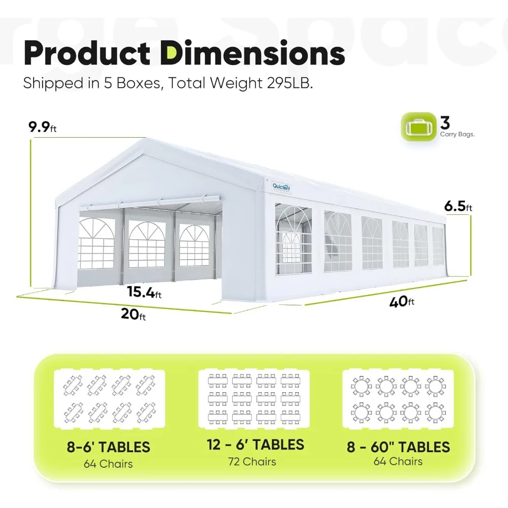 - 【Multiple Usage】Explore the versatile usage of our 20 x 40 ft event tent. It is ideal for commercial and recreational uses. You can use it for weddings, family gathering, graduation ceremories, parties, party rentals,backyard events or any large-scale events you can think of. Our tent can accommodates over 12 tables and is able to accommodate up to 60-80 people.