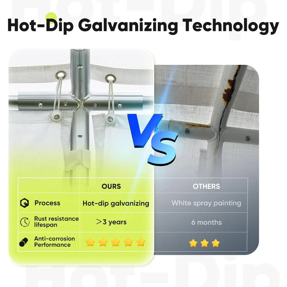 - 【Heavy Duty Structure】Our canopy features a upgrade durable iron metal frame with 1.5-inch diameter poles and a thickness of 1.2 mm, ensuring outstanding stability and wind resistance.Tips: the ground nails are essential to improving stability on grassy surfaces, while expansion screws do the same for cement surfaces; Take preventative measures to avoid wind when wind speed reaches 25 mph or higher.