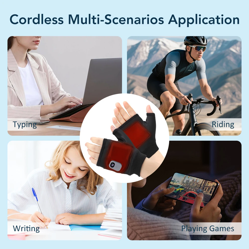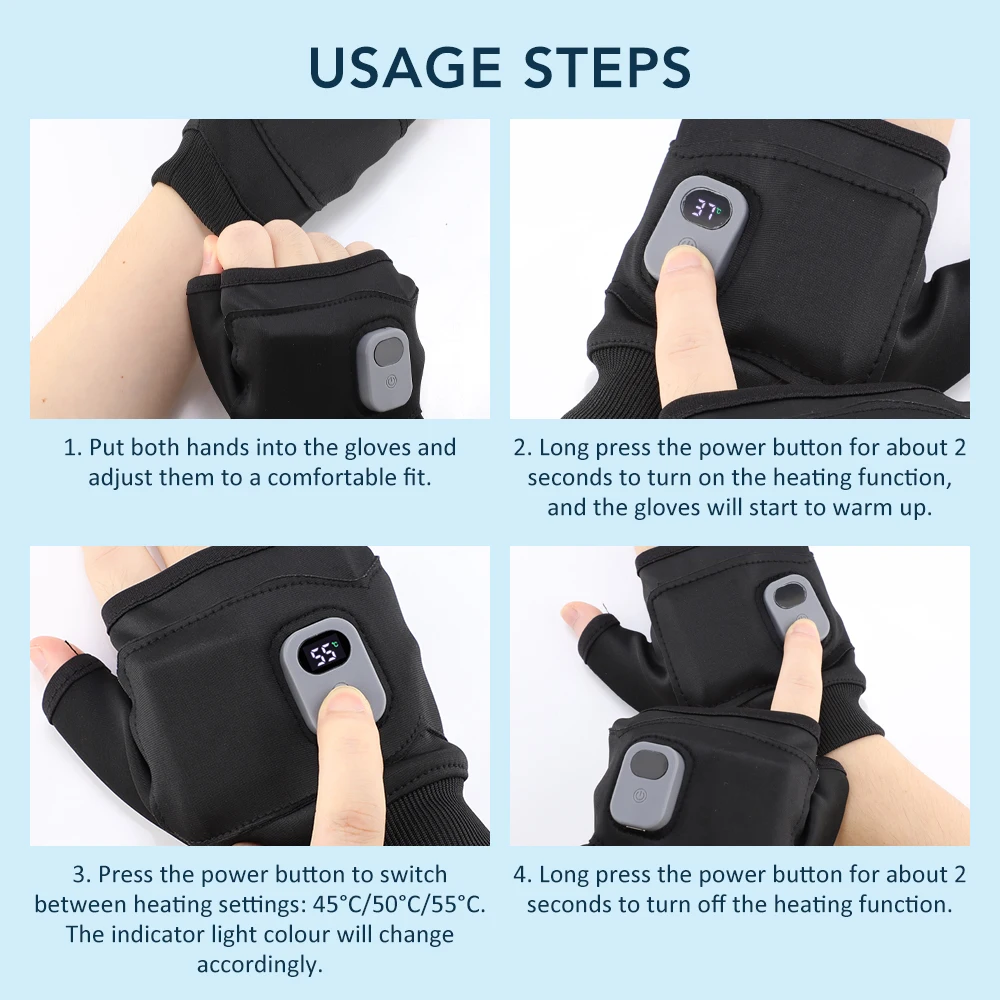 1. Our finger less heating gloves feature a smart temperature control system that allows you to easily adjust between three heat settings (45°C, 50°C and 55°C). This provides warmth and a therapeutic heat massage to improve blood circulation and relieve your hands.