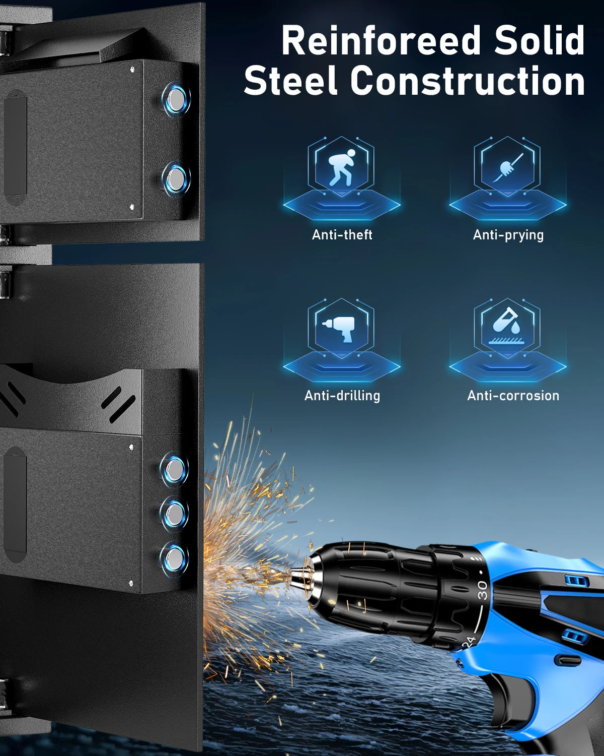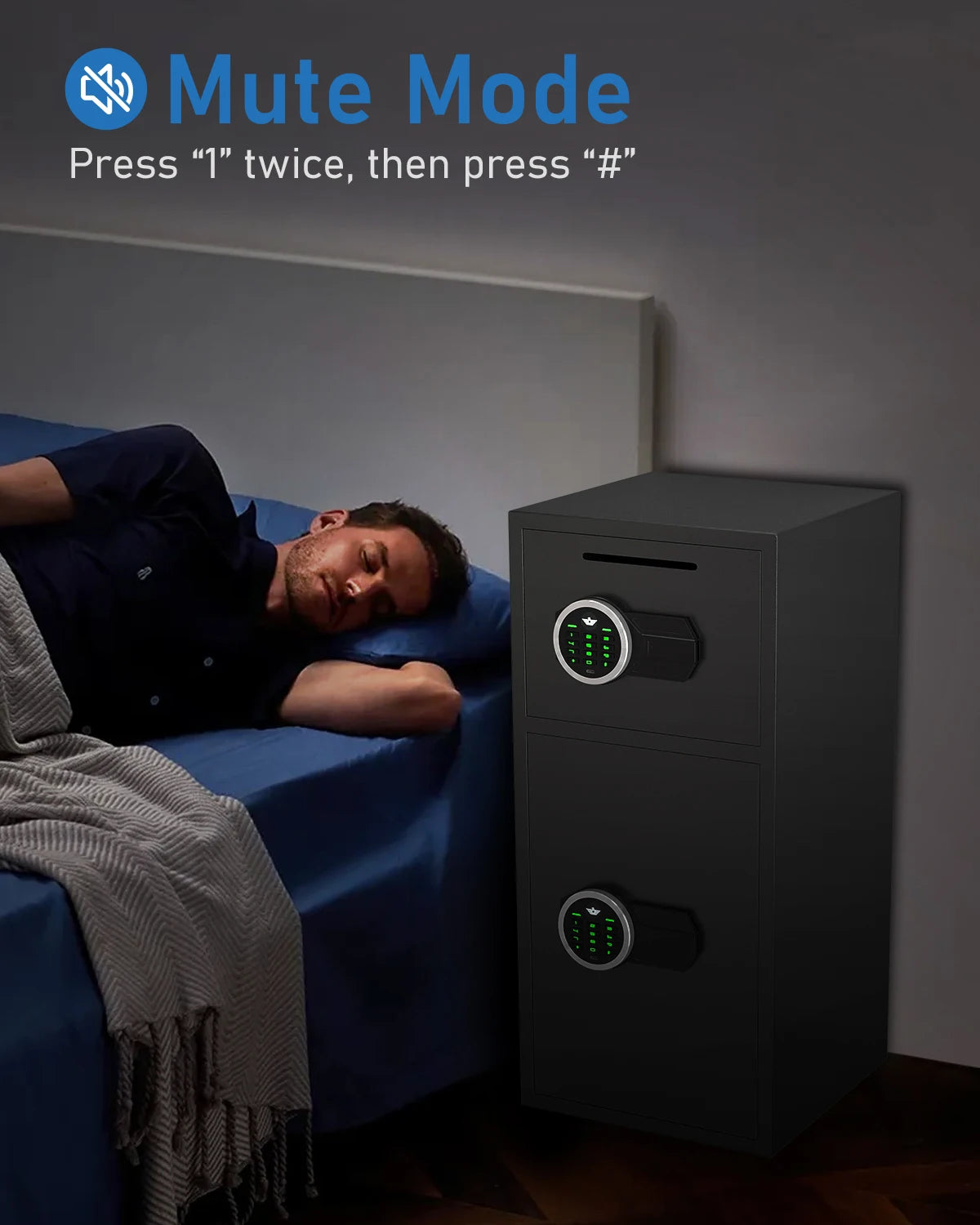 Backlit keypad can let you easily see and operate the password clearly even in the dark; When you open the safe with password, the led light will on automatically, you can quickly find what you want. Mute function is also necessary for you when you want to open the security safe without making a sound, will not disturb your family or remind intruders.