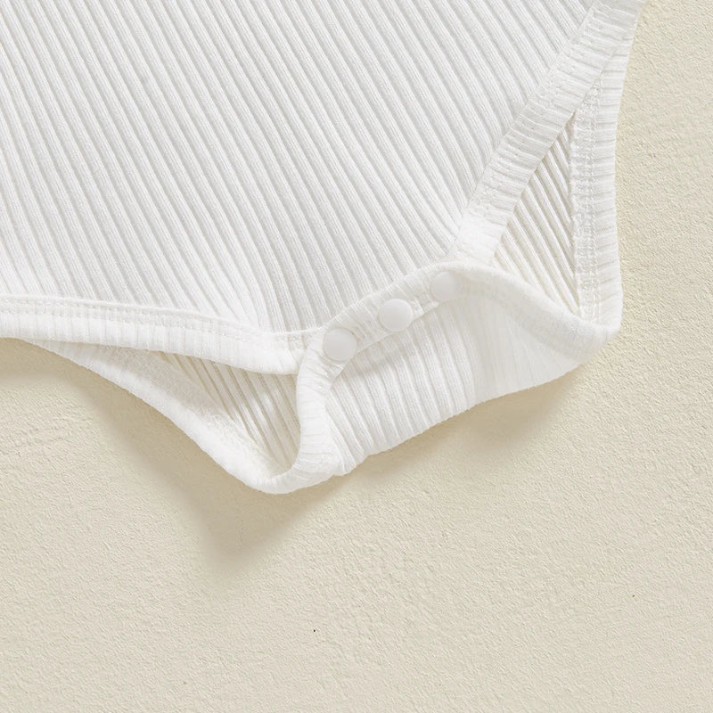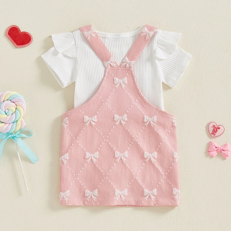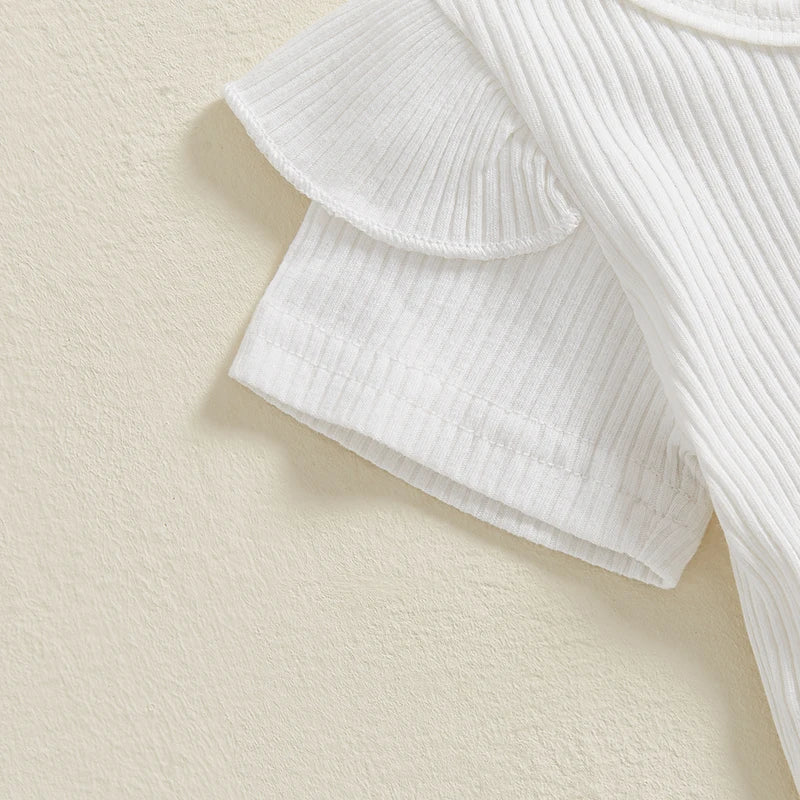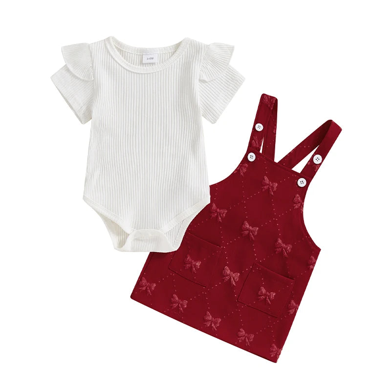 Baby Girls Summer Clothes Solid Ribbed Short Sleeve Romper with Bow Pattern Overall Dress 2 Piece Set