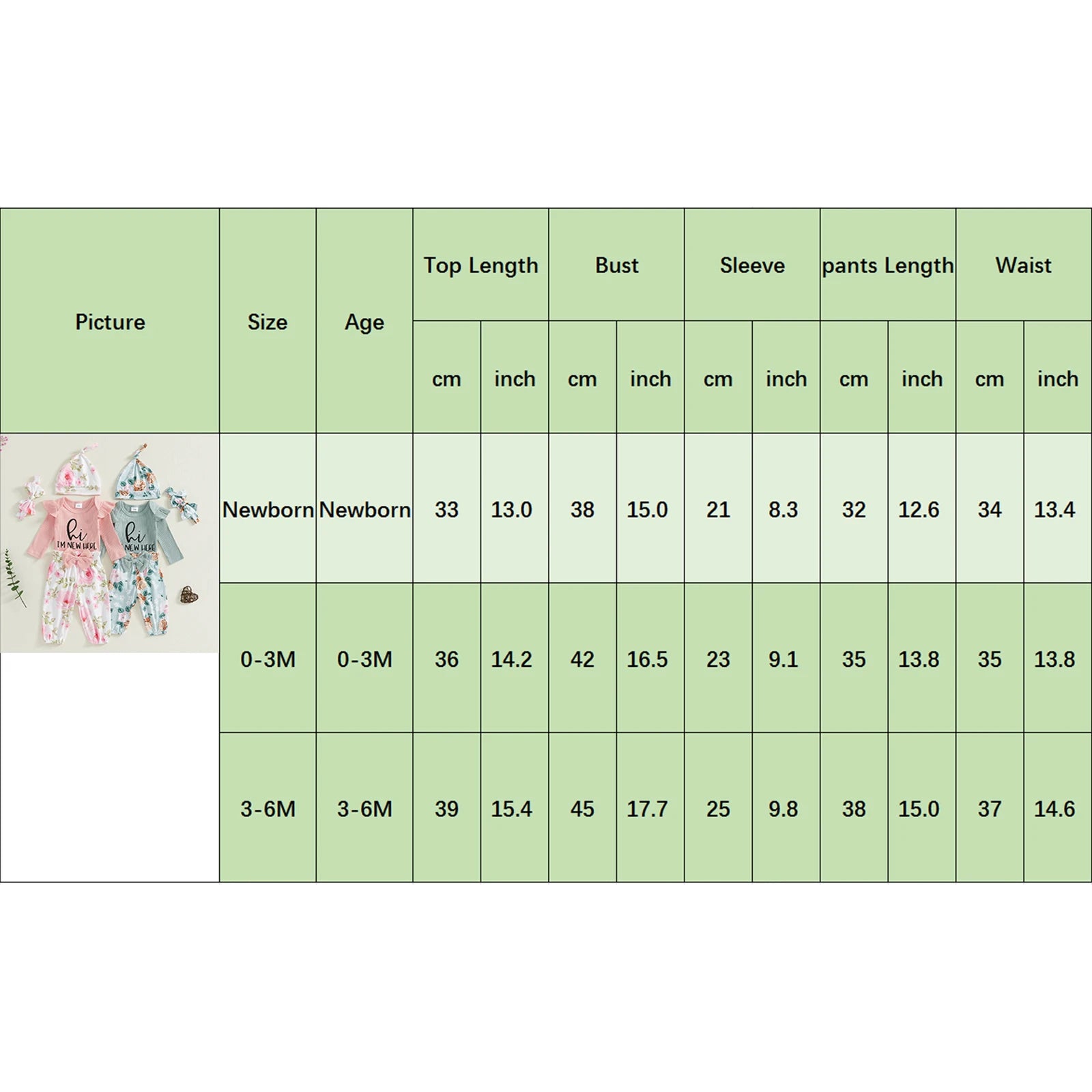 Baby girl romper with letter print, round neck, ruffles, long sleeves; Baby girl pants with floral print, cute bow, elastic waist design; And cute headband and hat set, make your little one cute and charming
