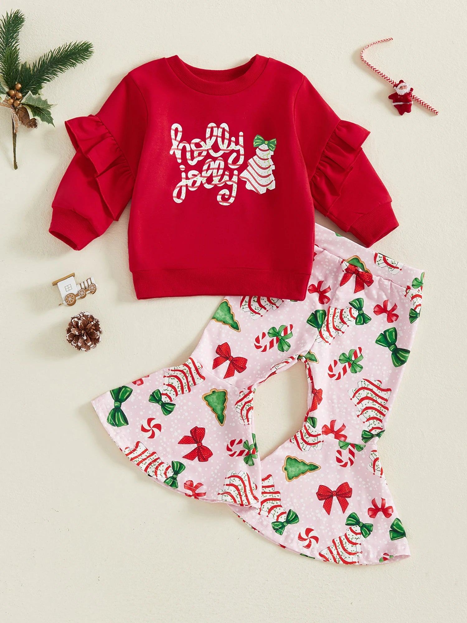 Toddler Girl Christmas Outfits Long Sleeve Round Neck Pullover + Elastic Waist Bow Tree Print Flare Pants 2 Piece Set