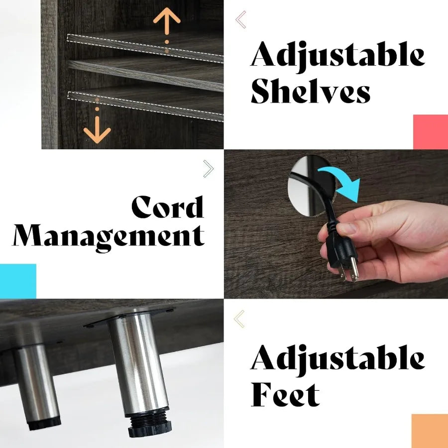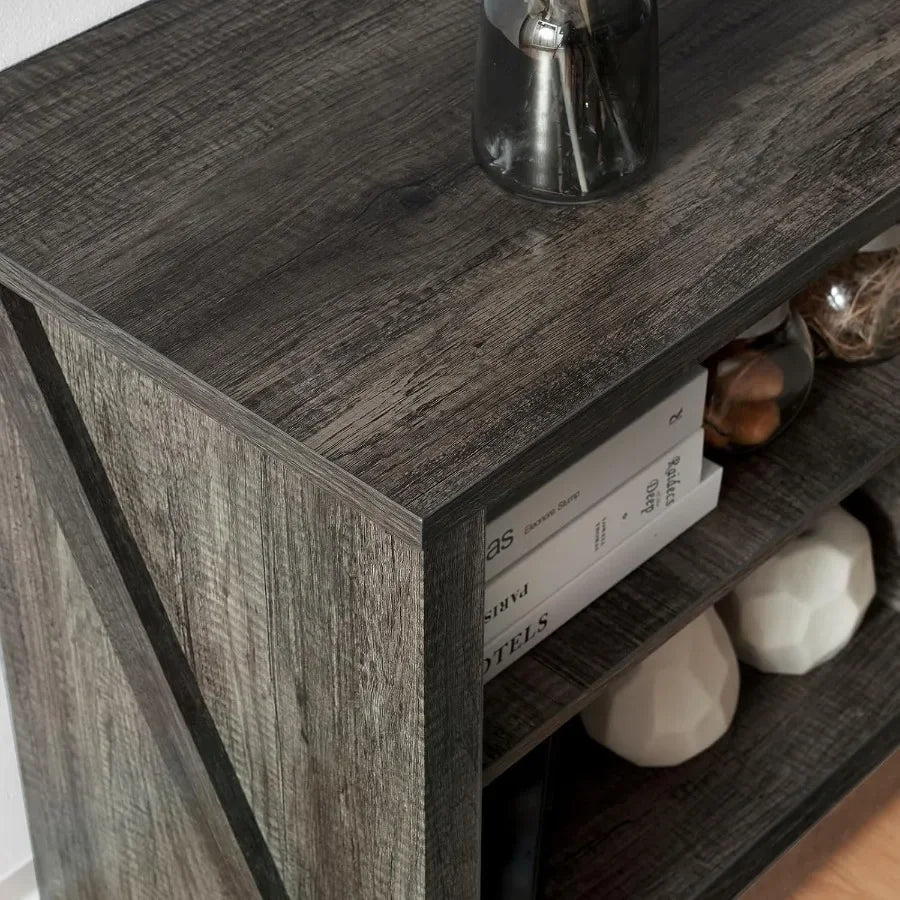 Classic rustic grey woodgrain finish performs a traditional&modern look. 3PCS adjustable&removable shelves for convenient and flexible storage and display.