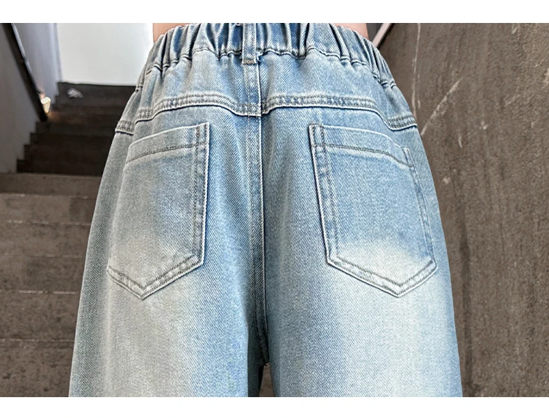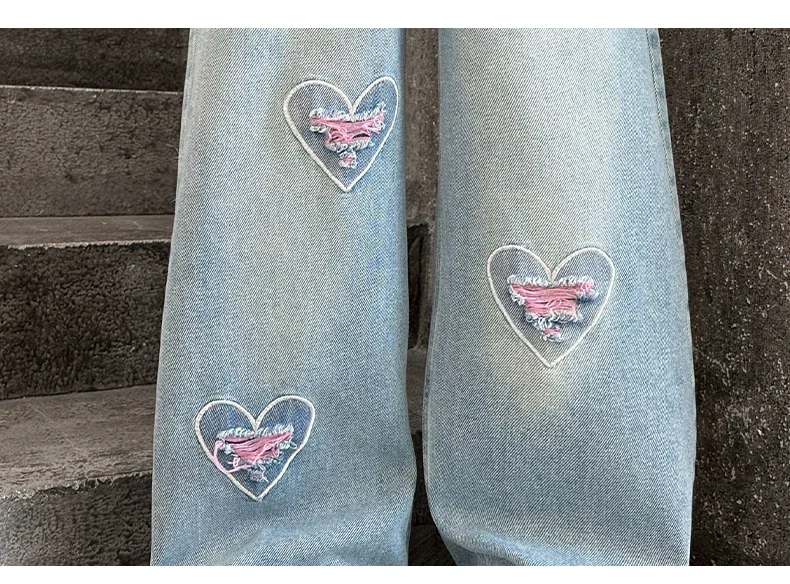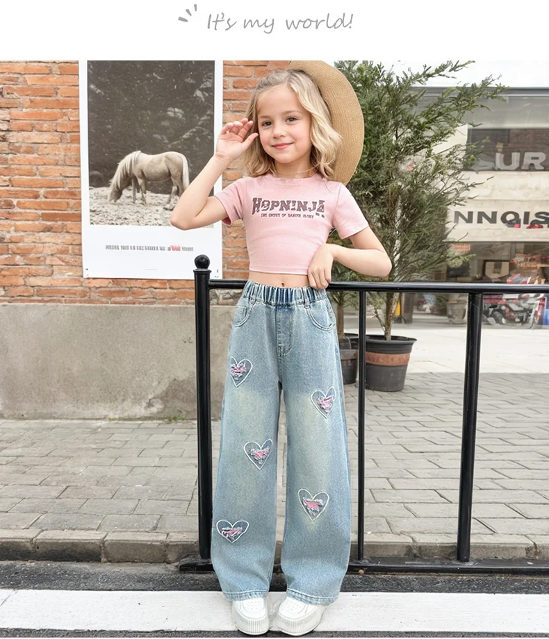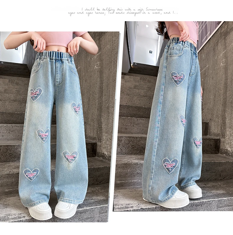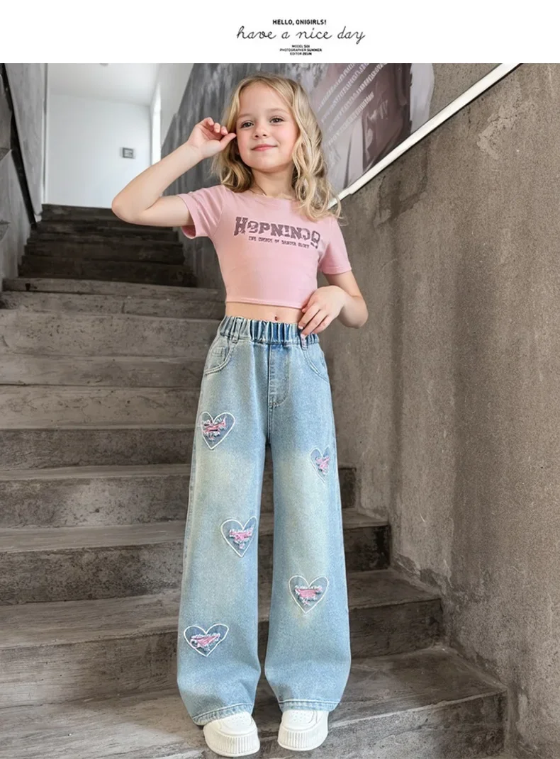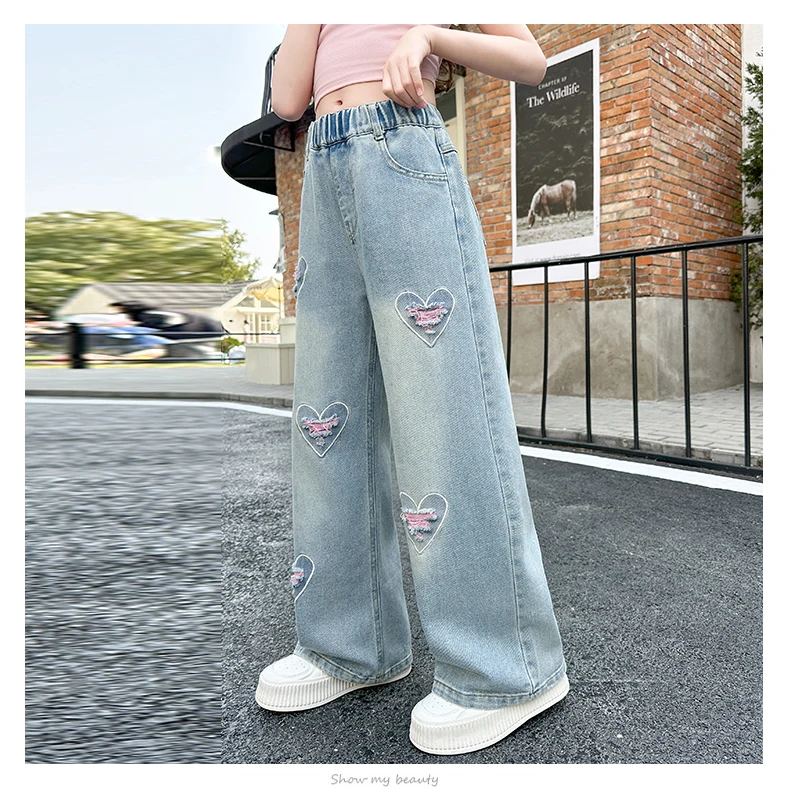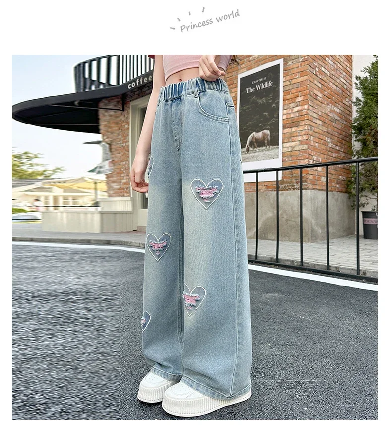 Girls pink love cut hole ripped jeans fashionable and versatile wide-leg straight-leg pants 5-15 years old