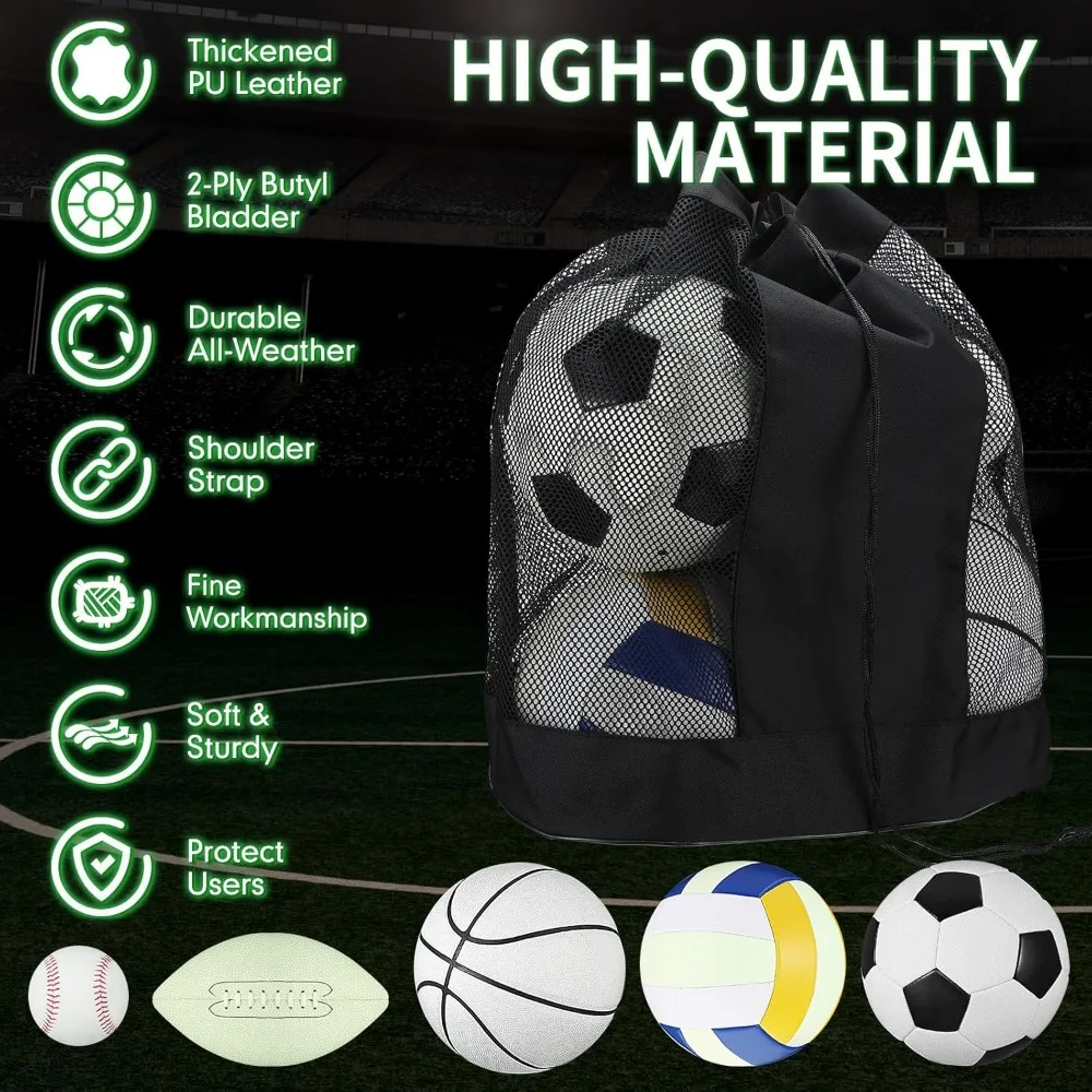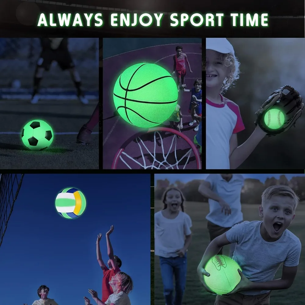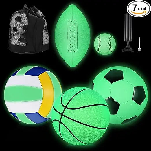 Discover our Glow in the Dark Sports Ball Set for an exciting night of play! This comprehensive set includes a football, basketball, soccer ball, volleyball, baseball, a pump, and a large carry bag that can hold up to five balls. Perfect for playing with friends, these balls are designed for both kids and teens and come in official sizes. The soccer ball is 7.9 inches in diameter, the basketball has a circumference of 27.5 inches, the football is 10 inches long and 18 inches in circumference, the volleyball is 7.8 inches in diameter, and the baseball has a circumference of 9 inches. These glowing sports balls are crafted from luminous material and require no batteries. Simply expose them to light for 30 minutes before use, and they'll glow in the dark all night long. When the glow fades, just put them under a light source again to recharge their luminescence. Ideal for a variety of settings, these balls can be used both indoors and outdoors, on hard surfaces, wet or grassy grounds, and are even suitable for the pool or beach. They come with a pump and carry bag for easy transportation. Made from durable PU material, these balls offer excellent flexibility, elasticity, and stability, ensuring they can withstand regular use. With machine stitching, they are firm and less likely to deflate, providing long-lasting enjoyment.