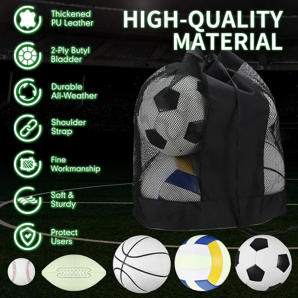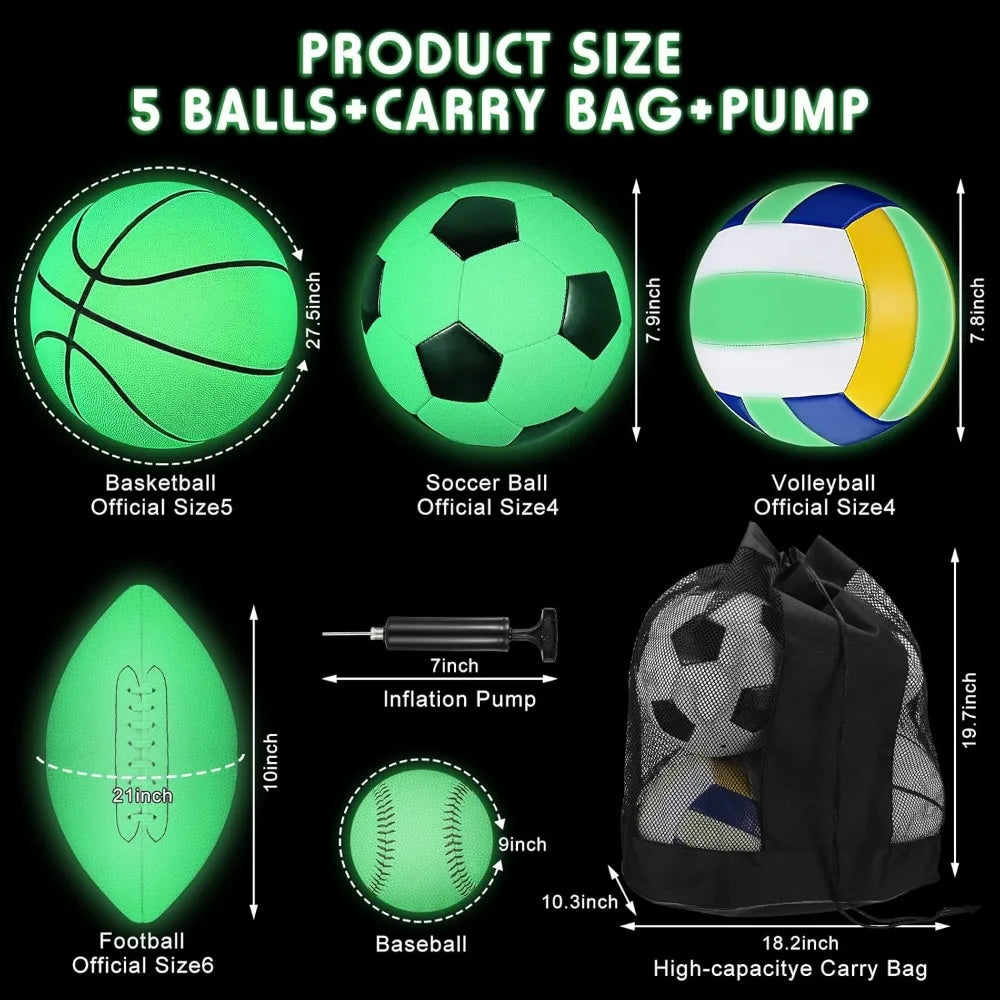 Glow in the Dark 5-Piece Sports Ball Set with Official Sizes: Football, Basketball, Soccer, Volleyball, Baseball - Includes Carr
