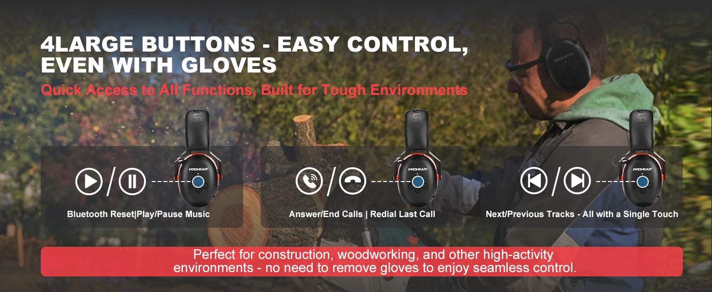 With the help of “raised part”, you will quickly get familiar with control buttons’ location. And you can make adjustments without taking off your muffs even wearing work gloves. PROHEAR Hearing Protection 037 has more intelligent buttons. You can easily adjust the volume, switch songs, answer or hang up the phone through the button of the earmuffs