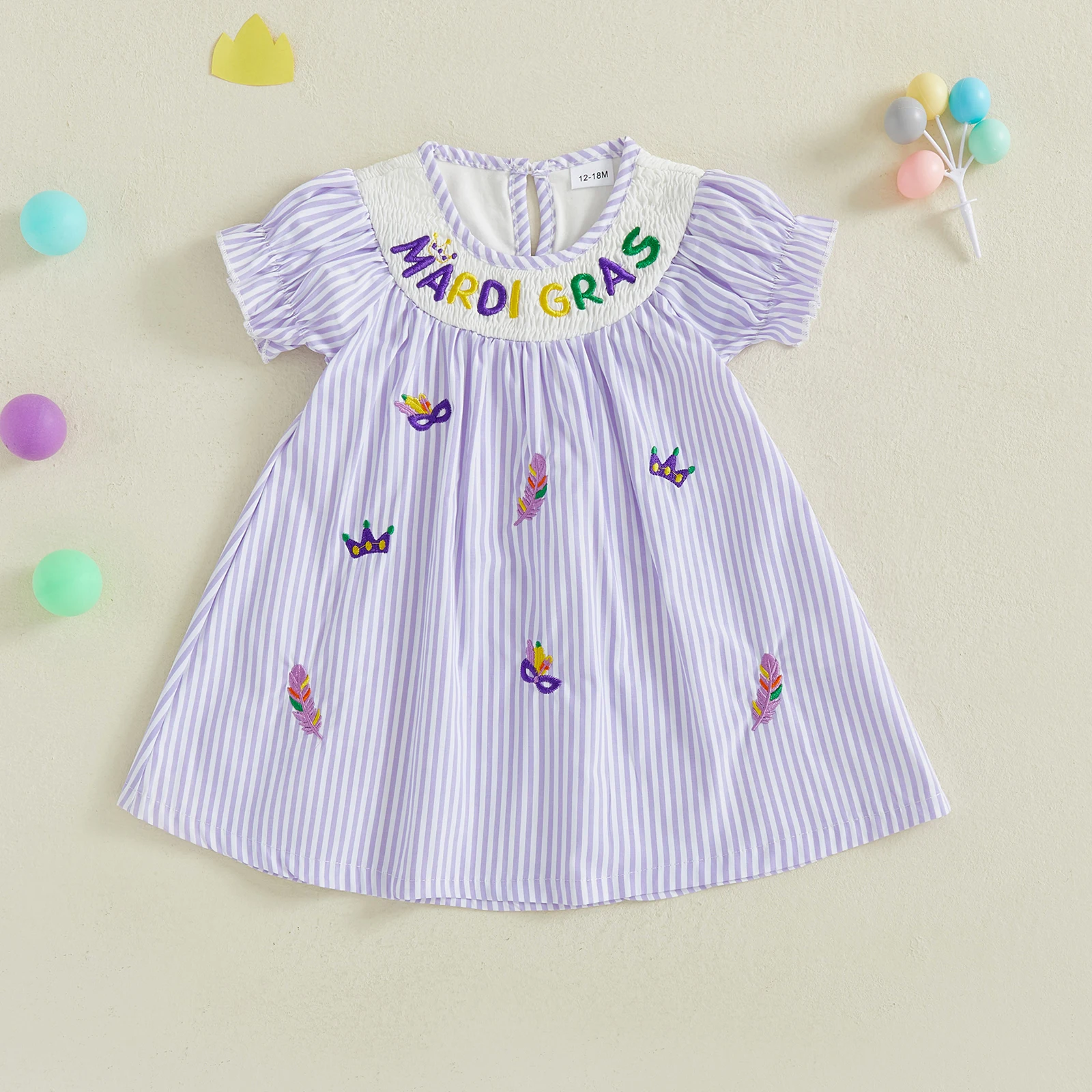 Toddler Baby Girl Mardi Gras Dress Loose Fit Letter Embroidered Striped Smocked Crew Neck Short Sleeve A Line DressSize (cm)