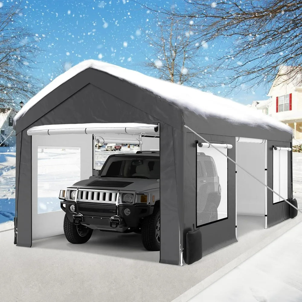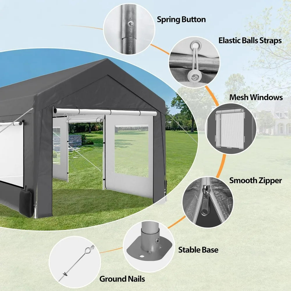 Upgraded 10 x 20 Ft Heavy Duty Carport, Portable Garage Shelter with with Roll-up Sidewall and Ventilated Windows, Sand Bags for hold down weight.