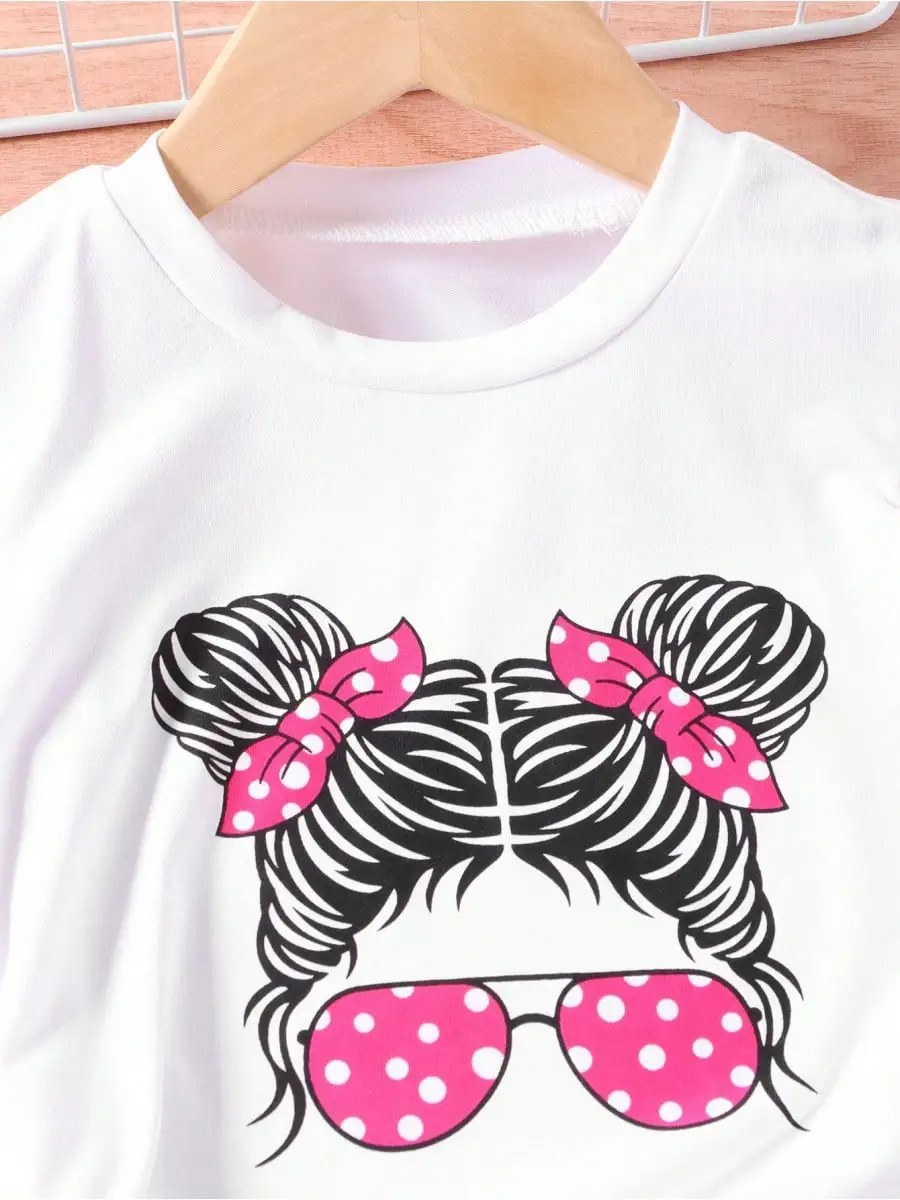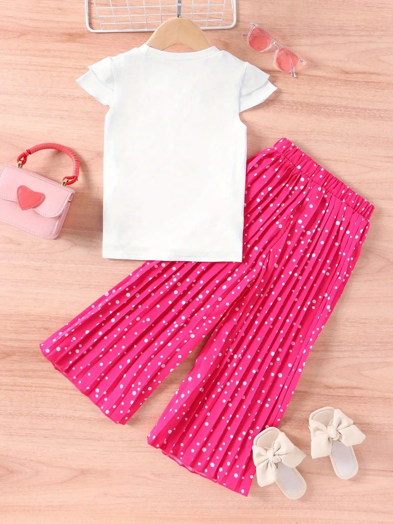 Young Girls Fashion 3-Season Set - Portrait Pattern Ruffle T-Shirt & Woven Long Pants