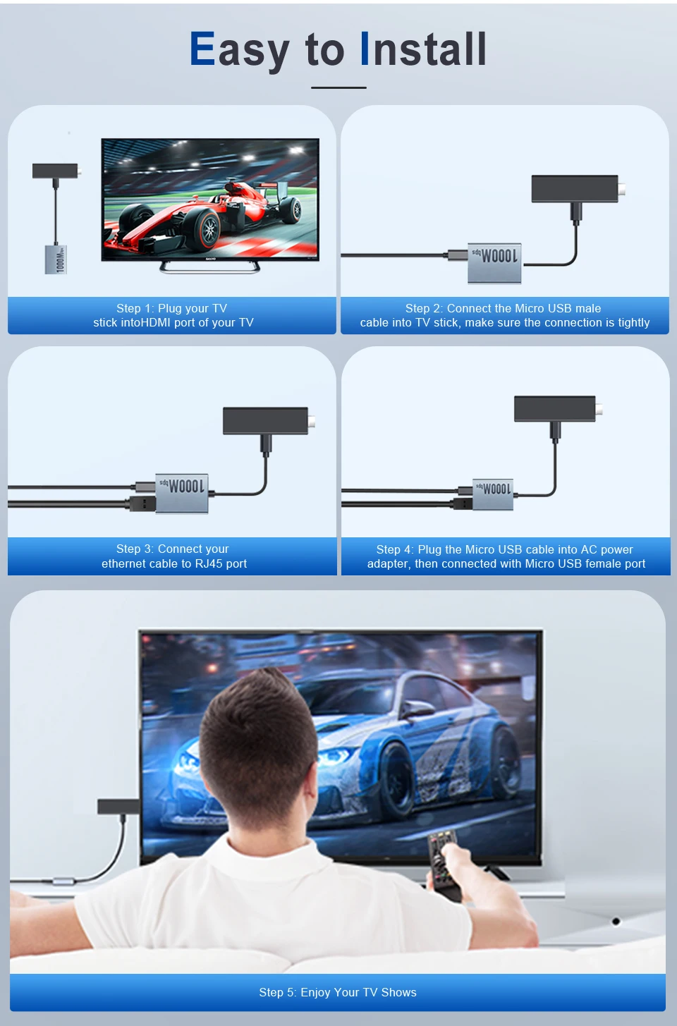 ●【Plug & Play】----Micro USB to Ethernet adapter serves as the bridge between RJ45 Ethernet cable and your TV Stick and does not require any driver or software installed, truly plug and play.